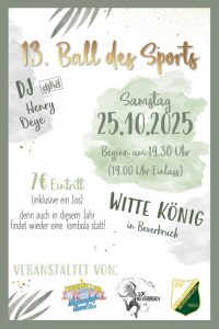 - Sportlerball 2025Am 25. November 2025 ist es wieder soweit – der 13. Sportlerball steht an.Gefiert wird im Witte König in Beverbruch, wo DJ HD (Henry Deye) für beste Stimmung und volle Tanzfläche sorgt. Datum: Dienstag, 25.11.2025Einlass: ab 19:00 UhrBeginn: 19:30 UhrEintritt: 7 € (inkl. 1 Los für die Tombola) Egal ob Sportler, Vereinsmitglied oder einfach Freund… Sportlerball 2025 weiterlesen